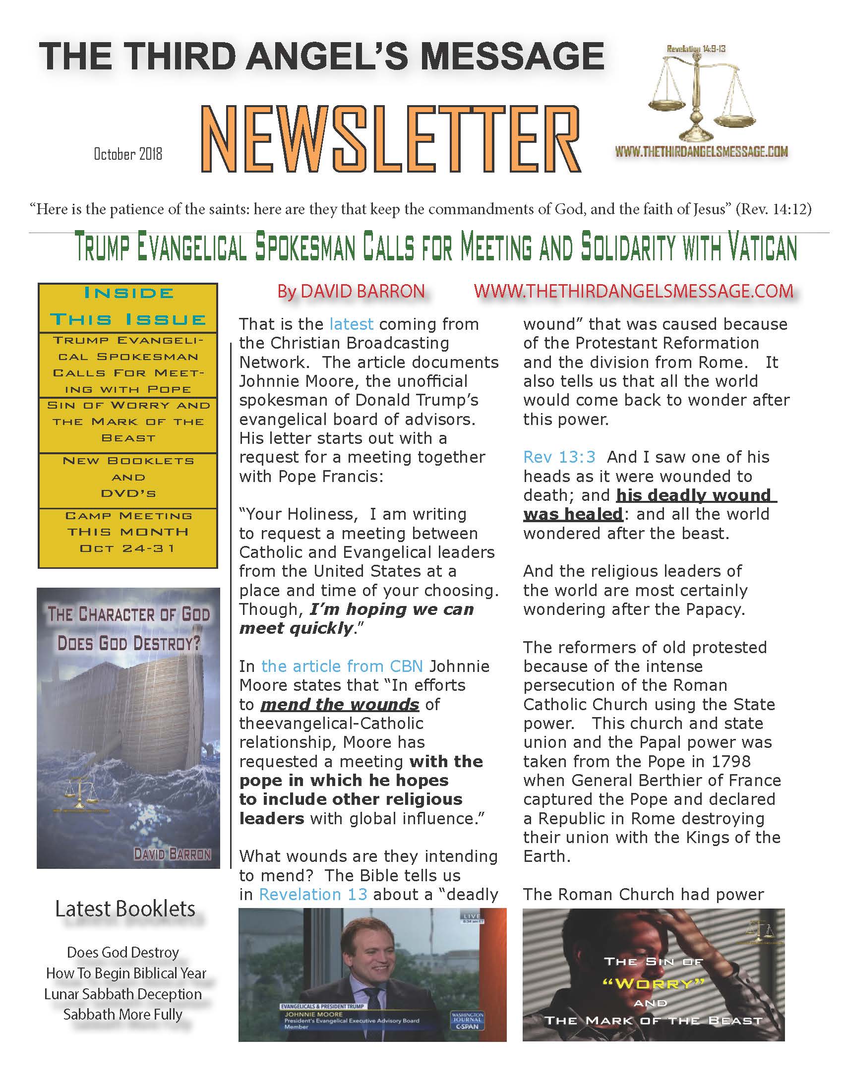 October 2018 Newsletter – Camp Meeting This Month – Schedule for Camp – Trump Evangelicals and Vatican – Worry